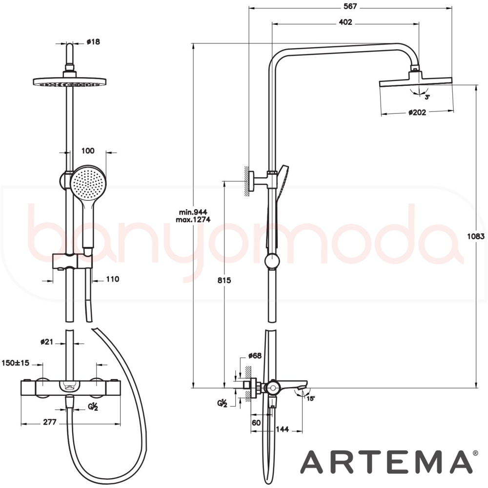 | Genel Açıklamalar: | 21 mm çapında ana kolon. Duş başlığının yukarı-aşağı yükseklik ayarı için teleskopik özellik. Termostatik batarya, 1F duş başlığı ve 1F el duşu ürüne dahildir. 202 mm çapında tepe duşu. 100 mm çapında el duşu. Armatür üzerindeki 2 yollu yönlendirici suyu duş başlığı veya el duşuna yönlendirir. Alttan el duşu çıkışlı (G 1/2") duş veya banyo bataryaları ile kullanılmalıdır. Sıva altı montaj yapılmadankullanılmaktadır. |
