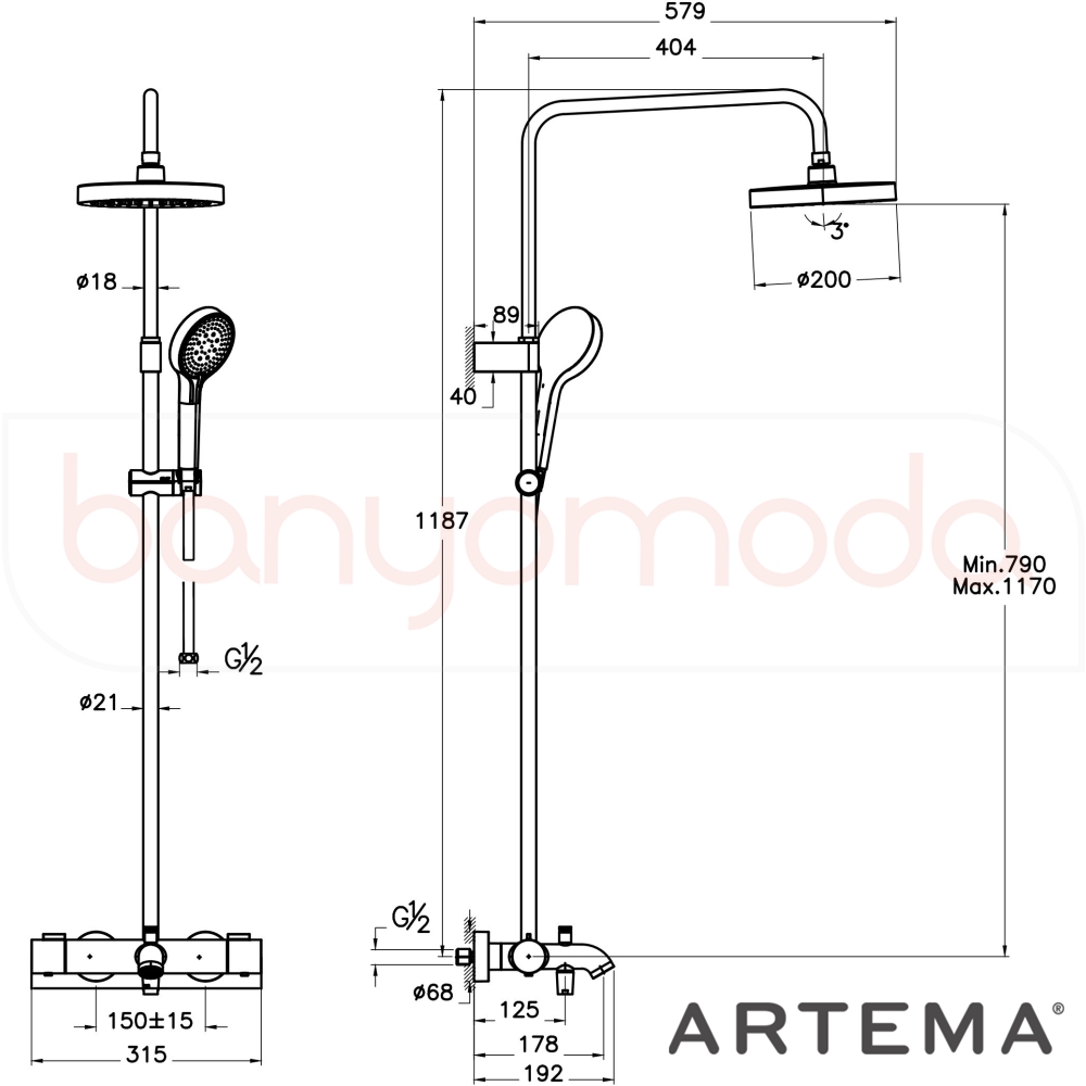 | Ürün Adı: | Artema Base Round 200 Duş Kolonu ve Termostatik Banyo Bataryası Sistemi, Mat Siyah |