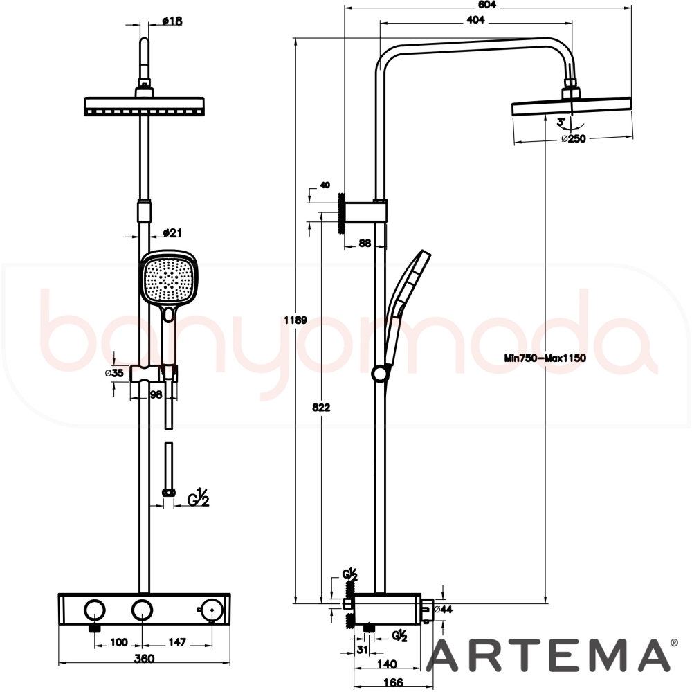 | Ürün Adı: | Artema Core Square 250 Duş Kolonu ve Termostatik Duş Bataryası Sistemi, Soft Bakır |