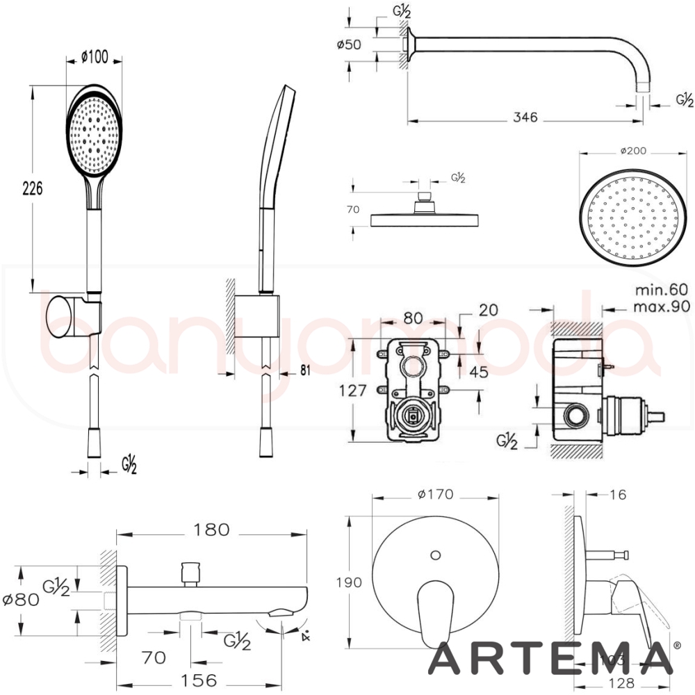 | Uyarı ve Genel Açıklamalar: | A43182 kodlu Artema Flow Round Ankastre Banyo Bataryası (Sıva Üstü Grubu), A41949 kodlu Artema Ankastre Banyo Bataryası (Sıva Altı Grubu, Minibox), A45904 kodlu Artema Base Round Duş Başlığı, 20 cm, Tek Fonksiyonlu, A45652 kodlu Artema Duvardan Dirsek (Uzun), A45907 kodlu Artema Base Round El Duşu Takımı ve A43126 kodlu Artema Root Round Çıkış Ucu, El Duşu Çıkışlı sete dahildir. |