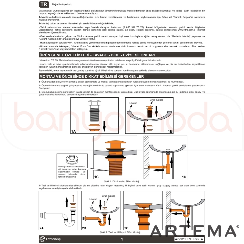 | Uyarı ve Genel Açıklamalar: | G 1 1/4" girişlidir. Lavabo sifon merkezi ile duvar arası. Minimum 90 mm Maksimum 247 mm'dir. Ölçülerin lavaboya uygunluğu kontrol edilmelidir. Plastik taslıdır. Süzgeç ürüne dahildir. Basmalı aç-kapa süzgeçlidir. Taşma deliksiz lavabolarla kullanılması önerilmez. |