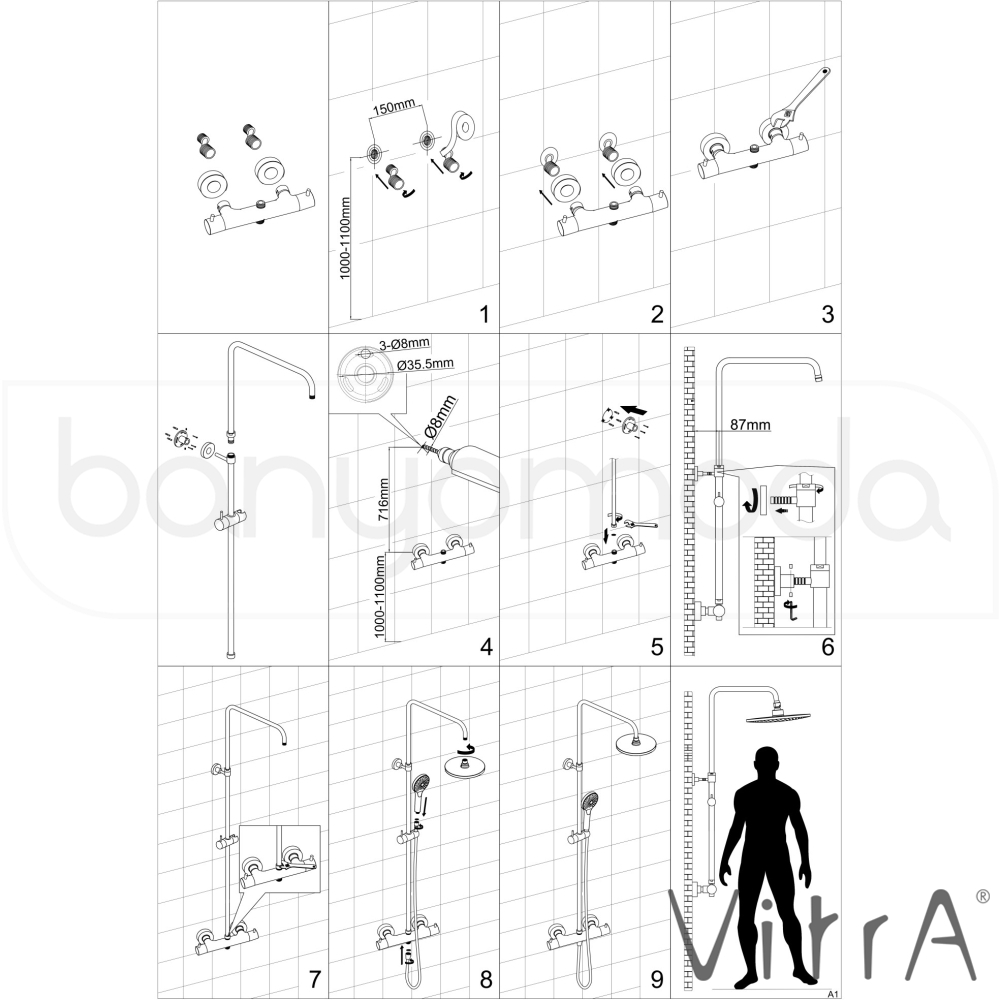 | Genel Açıklamalar: | 24 mm çapında ana kolon. Duş başlığının yukarı-aşağı yükseklik ayarı için teleskopik özellik. Termostatik batarya, duş başlığı ve el duşu ürüne dahildir. 240 mm çapında tepe duşu. 120 mm çapında el duşu. Armatür üzerindeki 2 yollu yönlendirici suyu duş başlığı veya el duşuna yönlendirir. 38 derece üzerindeki sıcaklıklara istenmeden çıkılmasını engelleyici emniyet butonu. Sıva altı montaj yapılmadan kullanılmaktadır. |