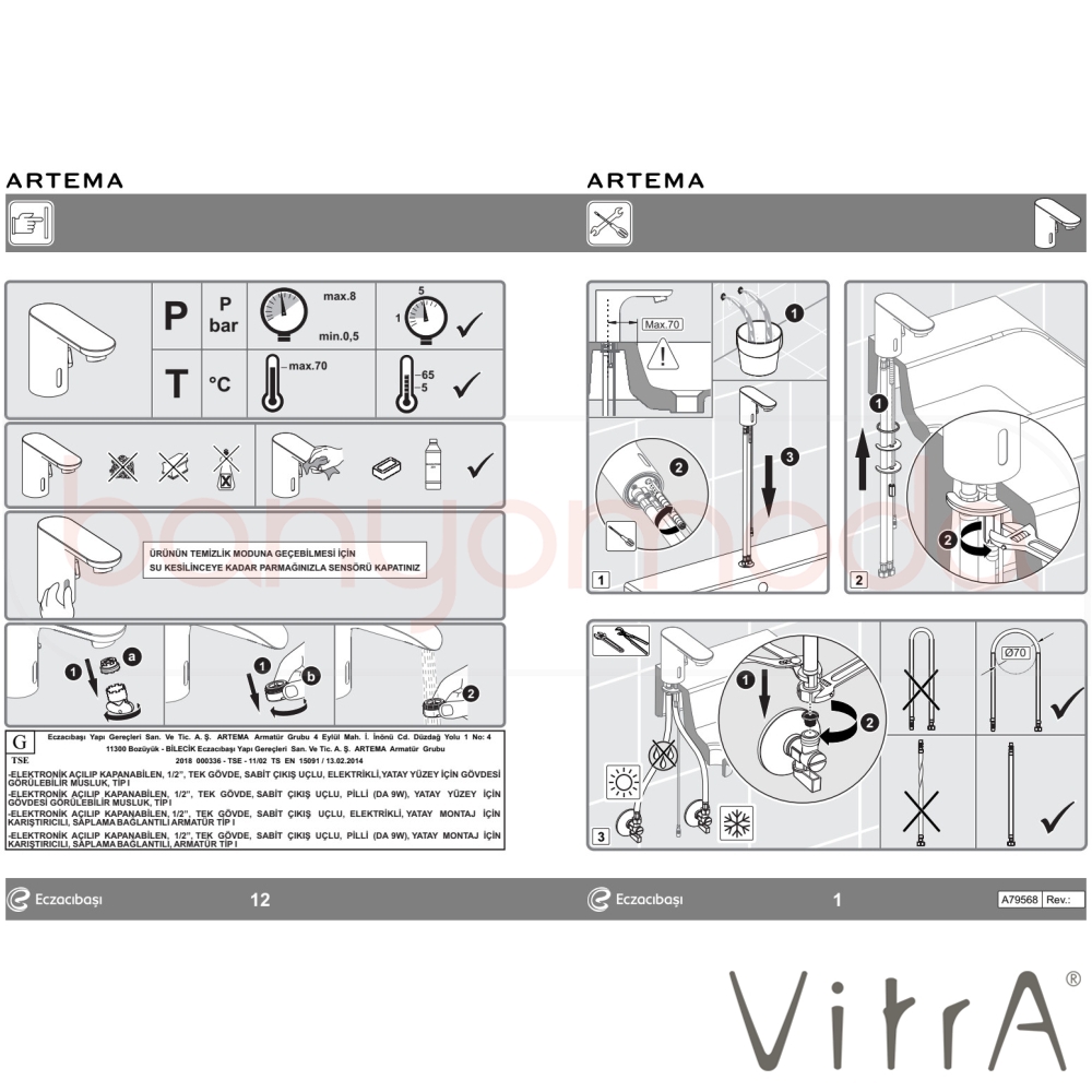 | Uyarı ve Genel Açıklamalar: | Akış başladıktan 60 sn sonra emniyet amacı ile otomatikolarak su kapanmaktadır. Çıkış ucu uzunluğu 142 mm’dir. Çıkış ucu yüksekliği 113 mm’dir. Sıcak-soğuk su bağlantılıdır. Pilli ürün 6V pil, elektrikli ürün 6V elektrik ile çalışır. Özel debi regülatörü sayesinde max. 1,3 L/dk su akışısağlanmaktadır. Sıcaklık ayarı için yandan kumanda volanı İki adet metal partikül filtreli ara musluk ve çek valfürüne dahildir. Armatür merkezi ile lavabo hazne başlangıcı arası max.70 mm olmalıdır. Perakende satışlar bedelsiz montaj kapsamındadır.Proje satışlarında ise numune daire bedelsiz montajkapsamındadır. |