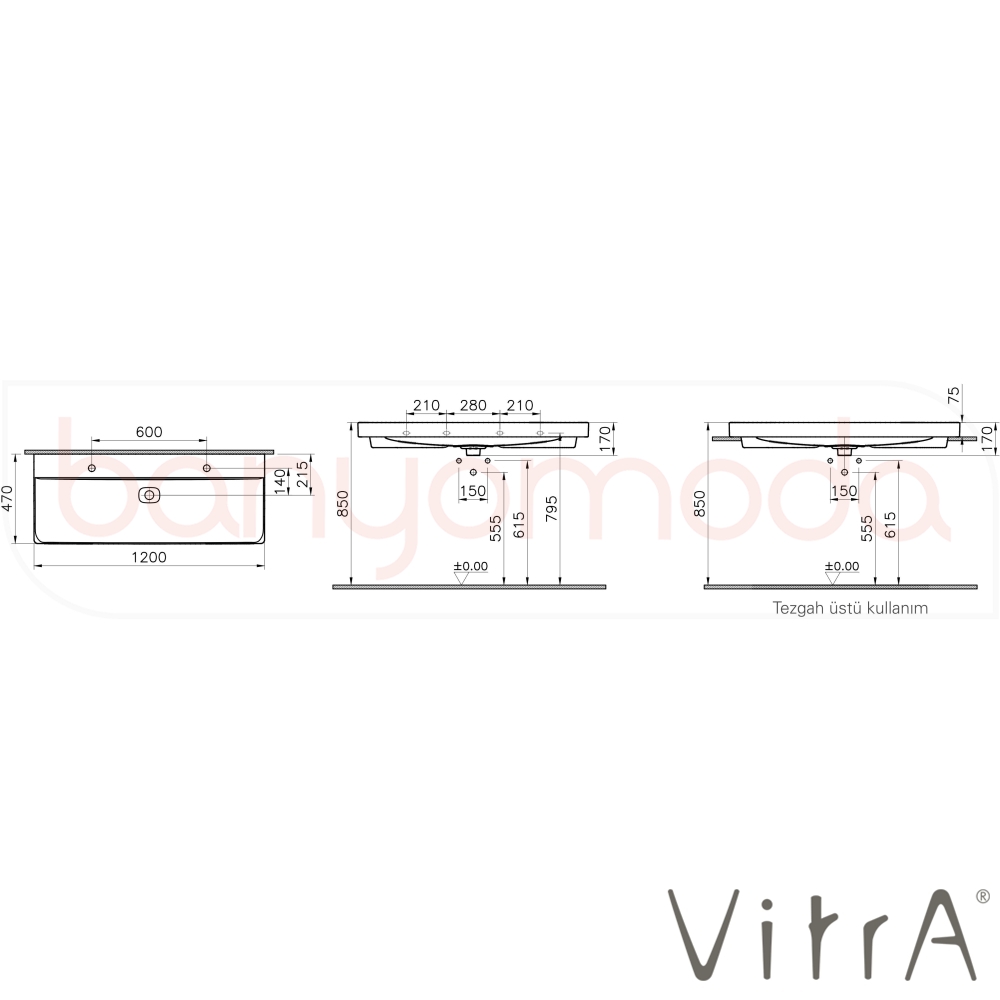 | Ürün Adı: | Vitra Metropole Çift Armatür Delikli Lavabo, 120 cm, VitraClean |