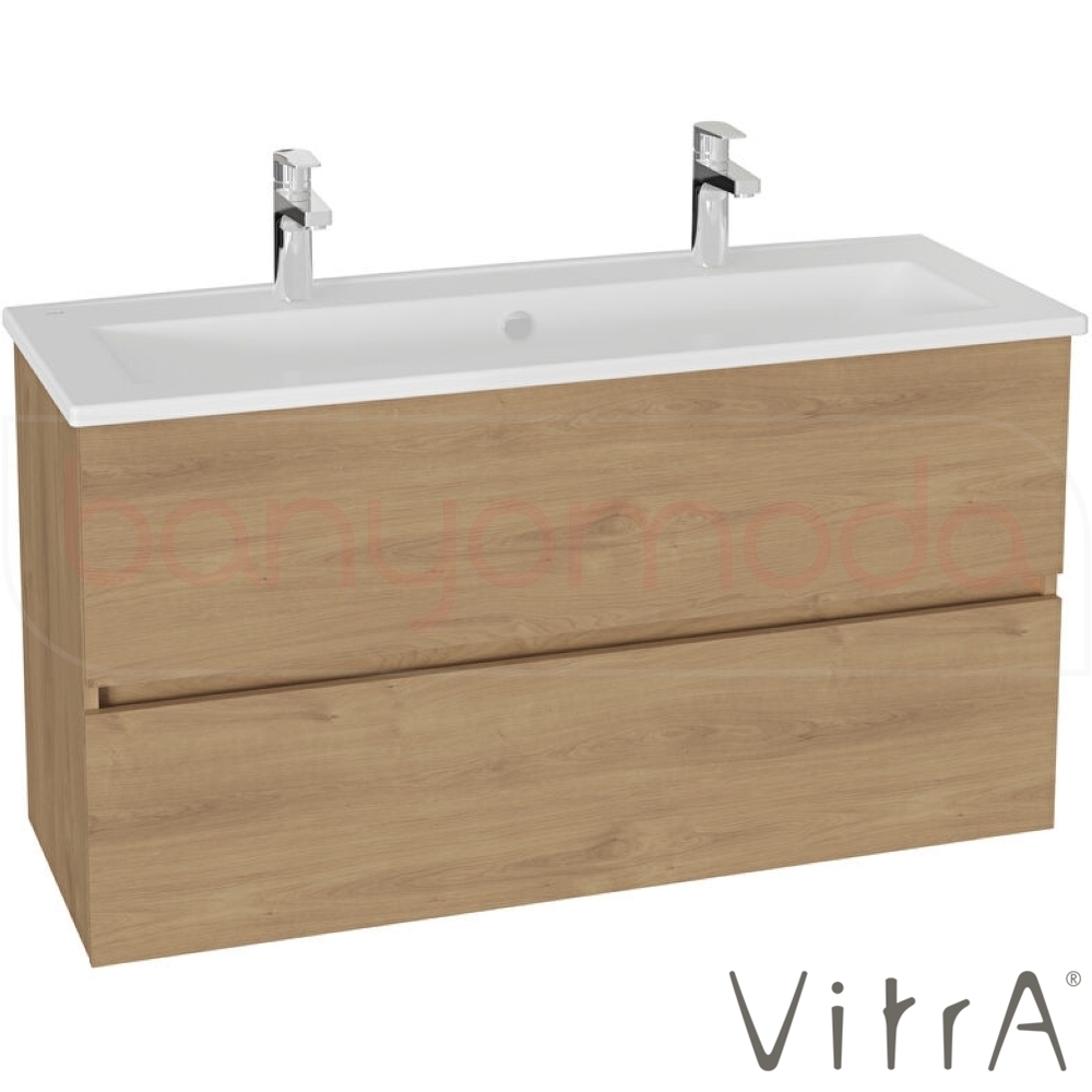 Vitra Mia Plus Square Çift Çekmeceli Lavabo Dolabı, Çift Armatür Delikli Lavabolu, 120 cm, Altın Meşe