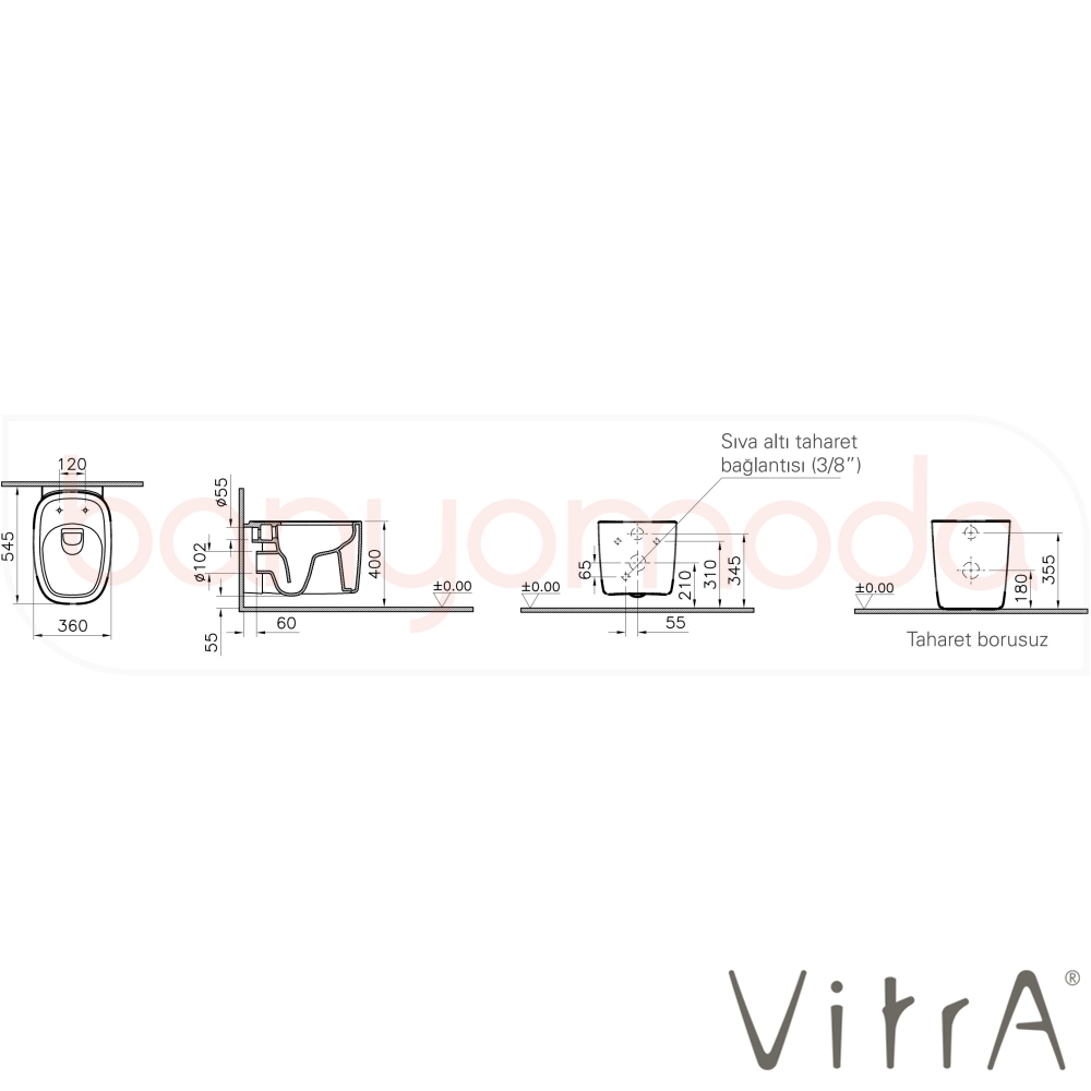 Marka: Vitra Ürün Adı: Vitra Plural Rim-Ex Kanalsız Asma Klozet, 55 cm, Mat Kum Beji Ürün Kodu: 7830B422-0090 Seri: Plural Renk: Mat Kum Beji Klozet Kapağı: Kapak Hariç Yüzey (Sır Özelliği): VitrA Clean Su Tasarrufu: 3-6 litre Pis Su Çıkış: Duvardan Montaj Tipi: Standart montaj Taharet Borusu Giriş: Universal Taharet Borusu: Var Yetkili Servis Hizmeti: Var Ücretsiz Montaj: Yok Garanti Süresi: 10 yıl Üretim Yeri: Türkiye Ölçüler: 36x55 cm Uyarı ve Genel Açıklamalar: Klozet kapağı hariçtir. Ayrıca sipariş edilmelidir. 126-422-009 kodlu Plural Duroplast, Mat Kum Beji, metal menteşeli, üstten sıkmalı, yavaş kapanır, kolay çıkabilir kapak, 126-422-029 kodlu Plural Duroplast Mat Kum Beji, bakır renk metal menteşeli, üstten sıkmalı, yavaş kapanır, kolay çıkabilir kapak ve 126-422-019 kodlu Plural Duroplast Mat Kum Beji, altın renk metal menteşeli, üstten sıkmalı, yavaş kapanır, kolay çıkabilir, kapaklarla uyumludur. 742-XXXX-01 ve 748-XXXX-01 kodlu gömme rezervuarlar ile uyumludur.