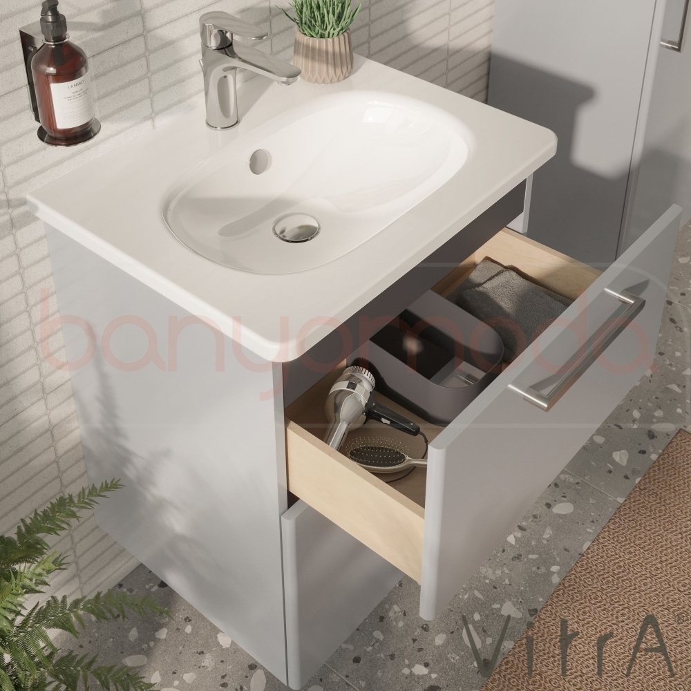 Vitra Root Flat İki Çekmeceli Lavabo Dolabı, 60 cm, Parlak İnci Grisi (Yuvarlak Lavabo Dahil)