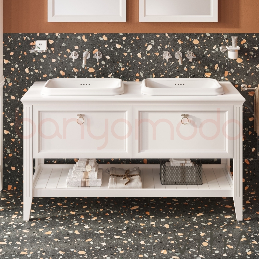 Vitra Valarte Çift Çekmeceli Tezgah Üstü Lavabo Dolabı, 150 cm, Mat Beyaz (Çift Lavabo Dahil-Krom Kulplu)